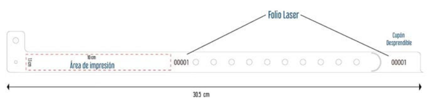 Brazalete intransferible por su broche de plástico. Es el modelo ideal para la entrega de productos o servicios dentro de un parque, hotel o evento por sus cupones desprendibles, con opciones de 2, 3 y 5 cupones y variedad de colores.